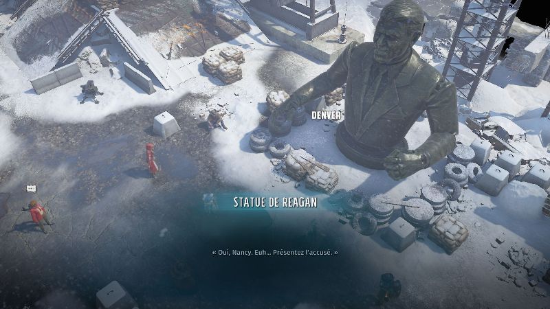 Si Wasteland 2 était un poil “fade” (toutes proportions gardées, le jeu reste bon), ce troisième opus corrige largement le tir. L’écriture des quêtes et des dialogues est une vraie réussite. En jeu, ça donne moult situations improbables et quelques échanges verbaux mémorables. Si on se rend à Denver, la première grosse étape du scénario principal, on y découvrira une espèce de secte vénérant un robot géant à l’effigie de Ronald Reagan. Puis à quelques centaines de mètres, ce sera une communauté de robots hippies dont l’un vous proposera de faire toutes sortes d’expériences sexuelles. Et le jeu est truffé de ce genre de lieux/séquences. Oserez-vous goûter au fameux clown burger sans en connaître les ingrédients ? Et si vous vous arrêtiez pour visiter l’atelier du Père Noel en cours de route. Si le scénario fil rouge se veut par moments un poil classique, vous pouvez largement compter sur tout ce qui viendra l’enrober pour rendre l’aventure mémorable, plus que celle de Wasteland 2. Plus que jamais, Wasteland 3 nous plonge dans un vrai univers post apo et n’hésite pas à oser frustrer le joueur en termes de résolution de quête en ne proposant pas forcément de happy ending, ce qui est très raccord avec le monde dépeint par la licence. Cerise sur le gâteau, la bande-son du jeu est vraiment excellente et balancera parfois un vrai morceau (musique + paroles) pour accompagner certaines séquences. Des morceaux absolument fabuleux qui enfoncent le clou et donnent au tout une ambiance juste incroyable. Je vous recommande vivement d’aller faire un tour sur Youtube pour y écouter Down in the valley to pray ou Battle hymn of the republic.